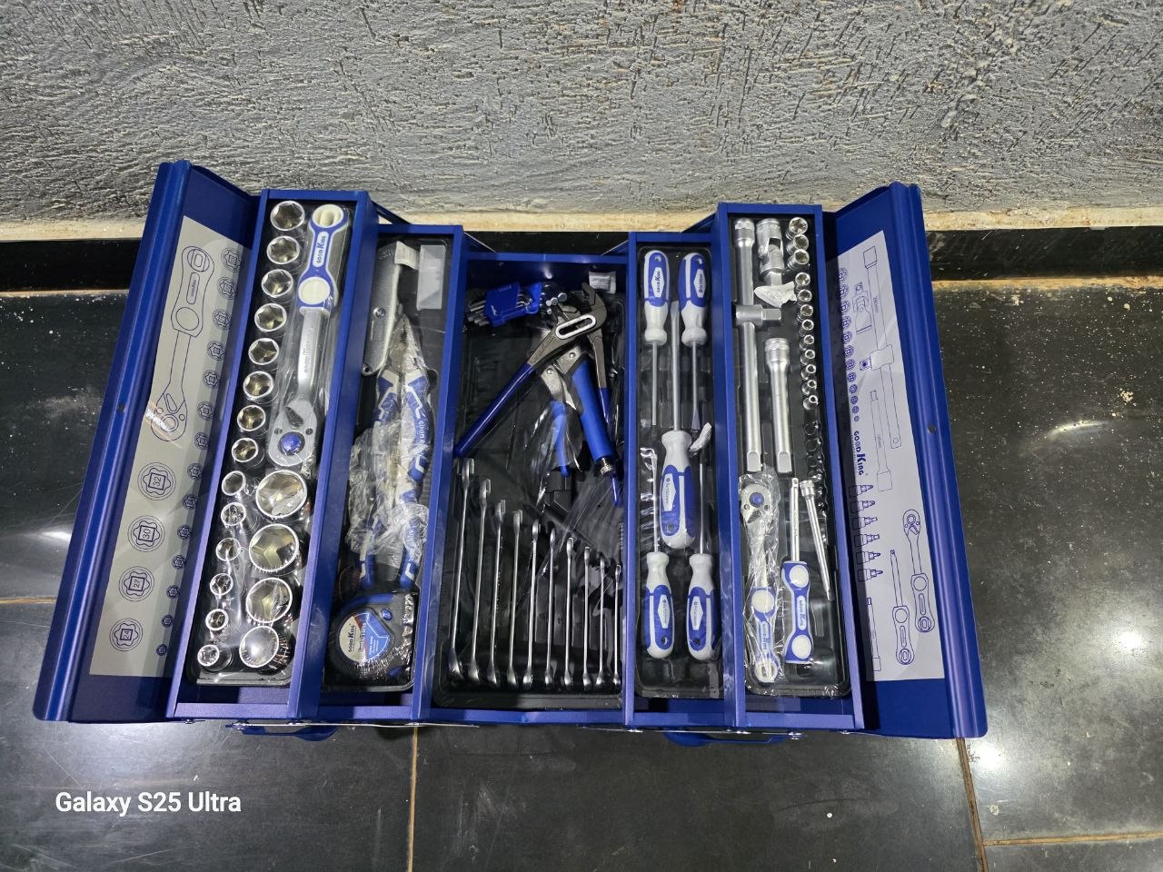 - Contains 85 pieces of various tools including sockets, wrenches, and pliers.